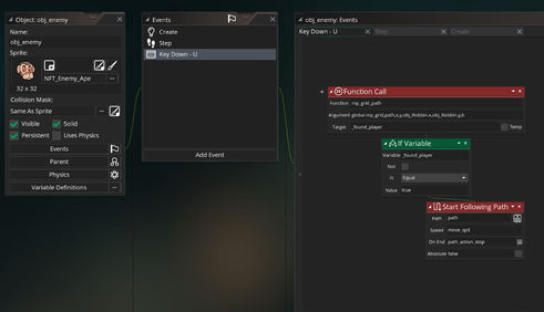 I created the "Purple Square" mechanic using DND in Gamemaker2 so that we could introduce a new element to our minigames and space out concepts to keep things interesting! This square is a bright purple that stands out against a dark background. This is intentionally colored to invite the player to use it. This square also allows the player to move through the square freely while the enemy cannot.